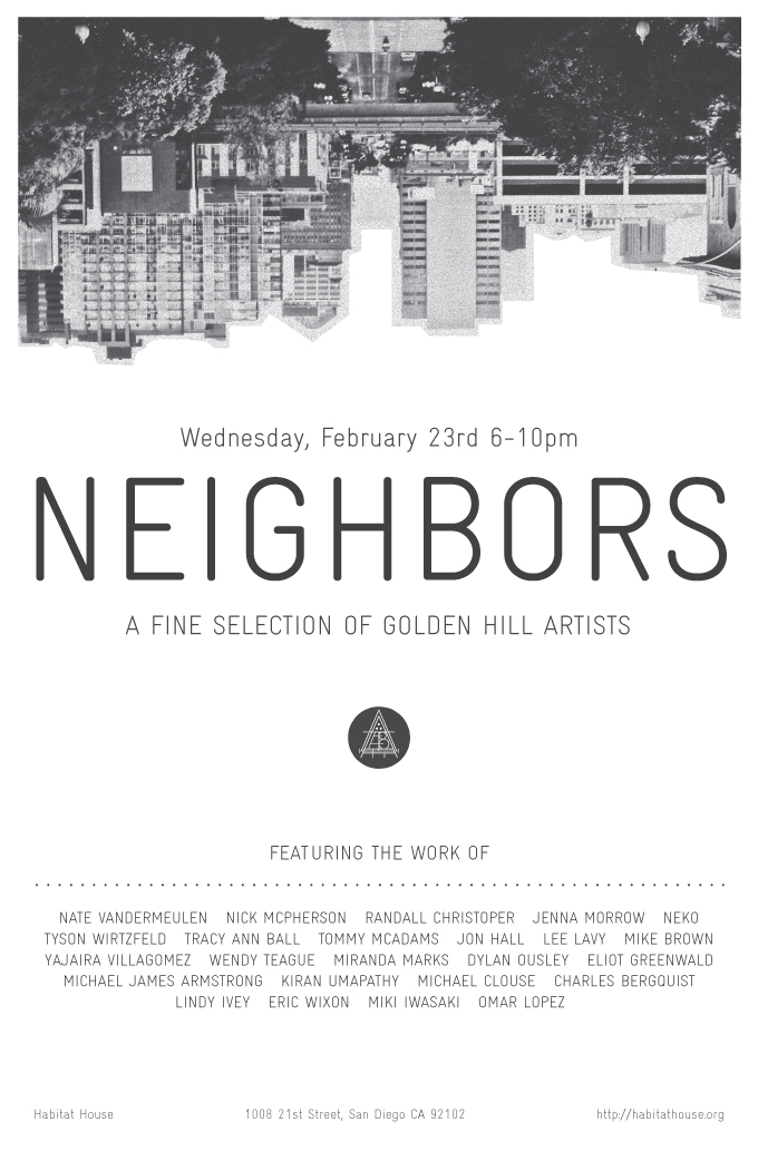 Lee and Michael at Habitat House February 21, 2011 | Ice Gallery Two ICE Gallery artists will have one piece each in the “Neighbors” show on 2/23, 6 – 10pm, in Golden Hill. Click the flyer below to visit the Habitat House website. See you there! Share this post:Share Click to share on Facebook (Opens in new window) Facebook Click to share on X (Opens in new window) X Click to share on Reddit (Opens in new window) Reddit Click to email a link to a friend (Opens in new window) Email Like Loading... Related